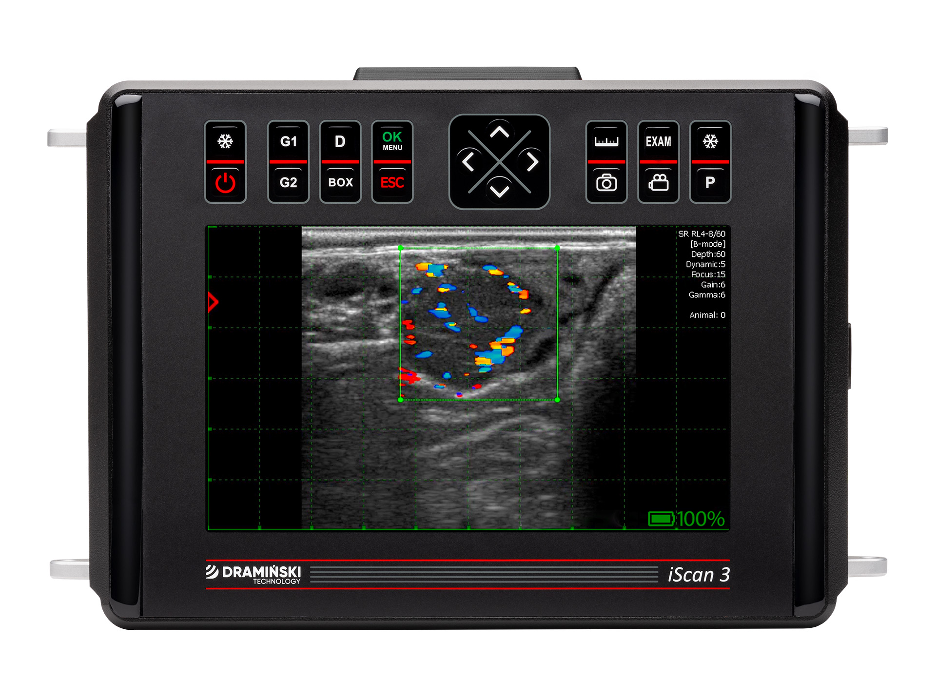 El ecógrafo iScan 3 está diseñado para el diagnóstico animal, principalmente del ganado bovino. Se utiliza para examinar el sistema reproductivo, los pulmones, los componentes del sistema digestivo, etc.